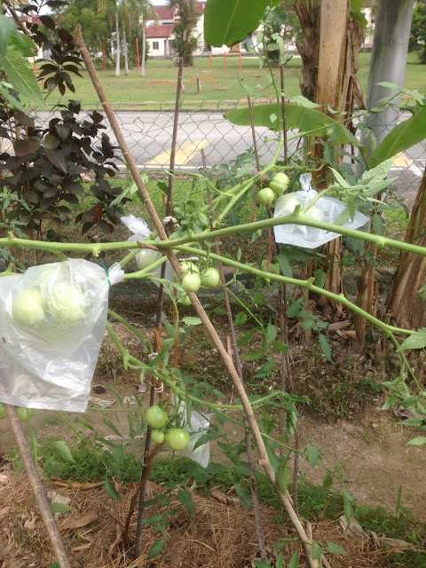 Pokok jagung yang sudah dituai di tebang untuk dikomposkan manakala pokok tomato yang sedang berbuah di buang daun2 yang telah tua
